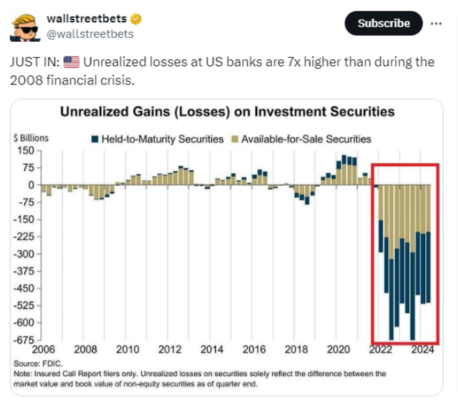 Ekonóm Henrik Zeberg vidí v tomto trvalom predaji možné varovanie týkajúce sa vyhliadok ekonomiky a celkového zdravia bankového sektora. Zeberg upozorňuje na alarmujúce údaje, ktoré naznačujú, že nerealizované straty amerických bánk sú v súčasnosti 7-krát vyššie než počas finančnej krízy v roku 2008.
