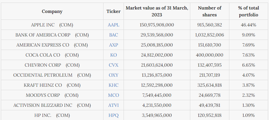 Najväčšie pozície v portfóliu Warrena Buffetta. Zdroj: Buffett.Online