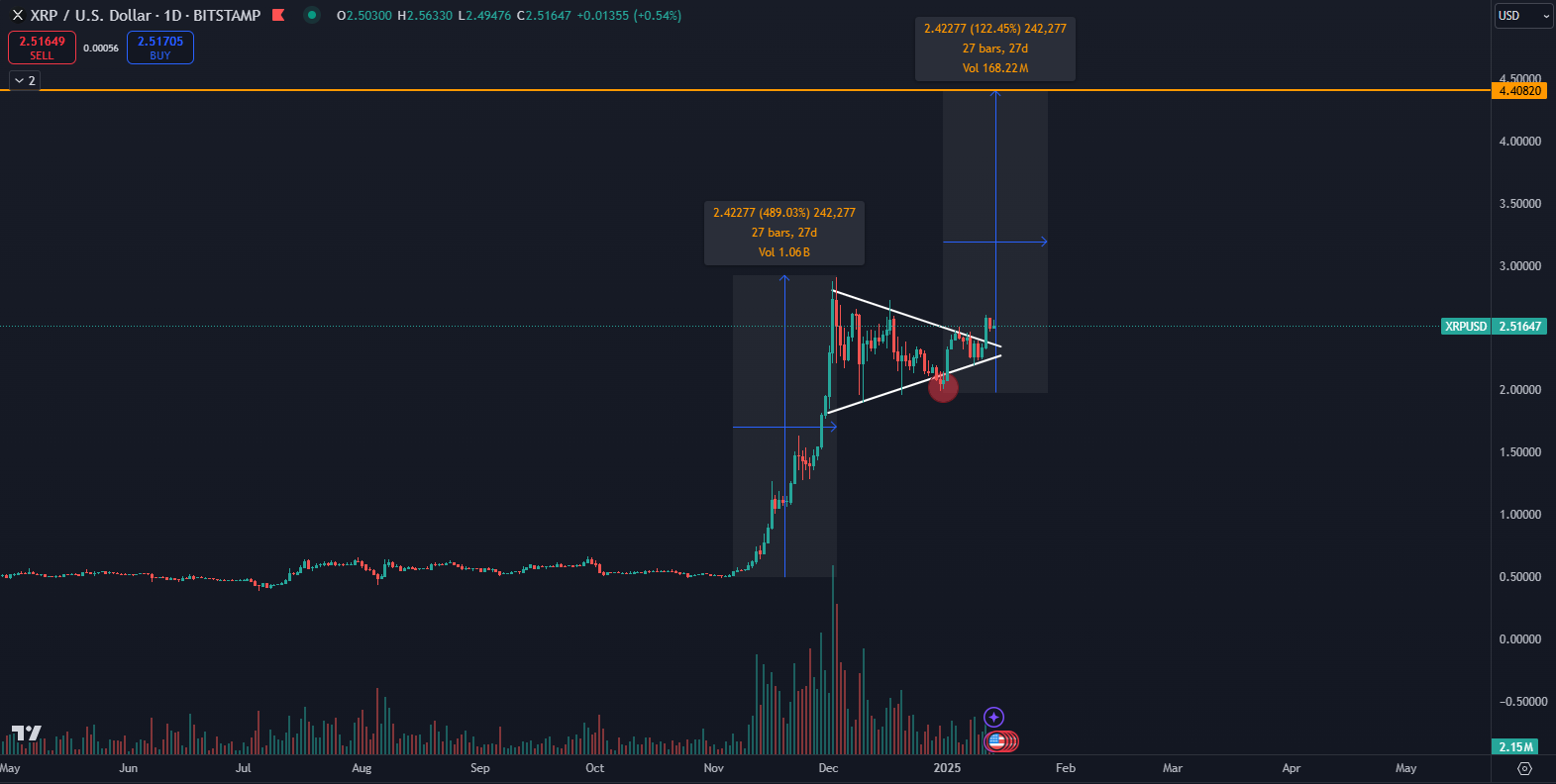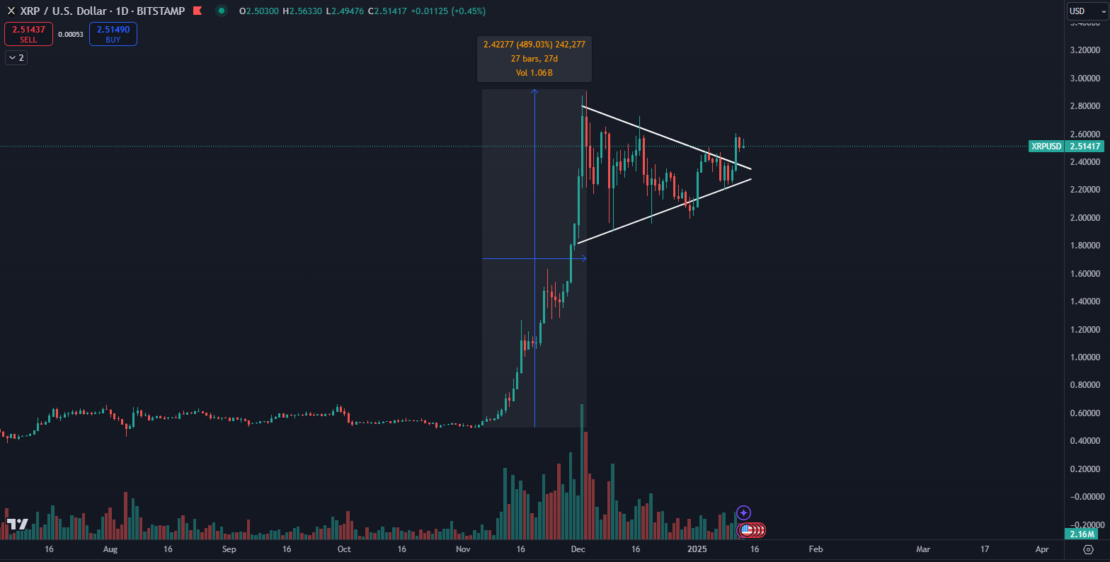 Laicky povedané, predávajúci nedokázali stiahnuť cenu na nižšie minimá. Namiesto toho sa znovu na trhu akumuluje. Výsledkom je, že cena prekonala rezistenciu trojuholníka pred 3 dňami, a preto je vysoká pravdepodobnosť, že úvod roka 2025 bude pre XRP veľmi pozitívny.