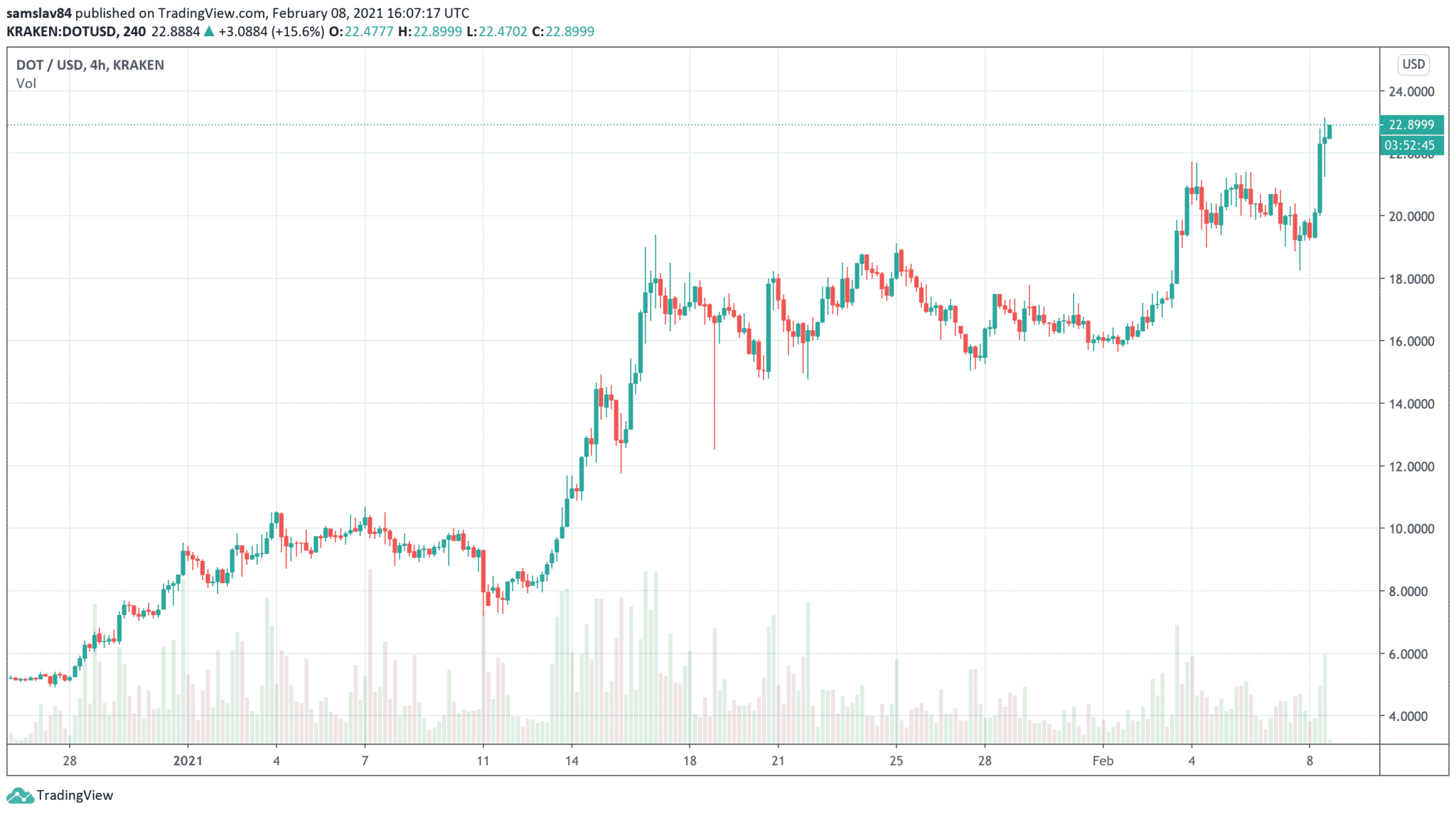 Cena polkadotu začala výrazne stúpať na konci minulého roka a pokračuje dodnes. Aktuálne sa táto kryptomena obchoduje na historickom maxime za 23 $.