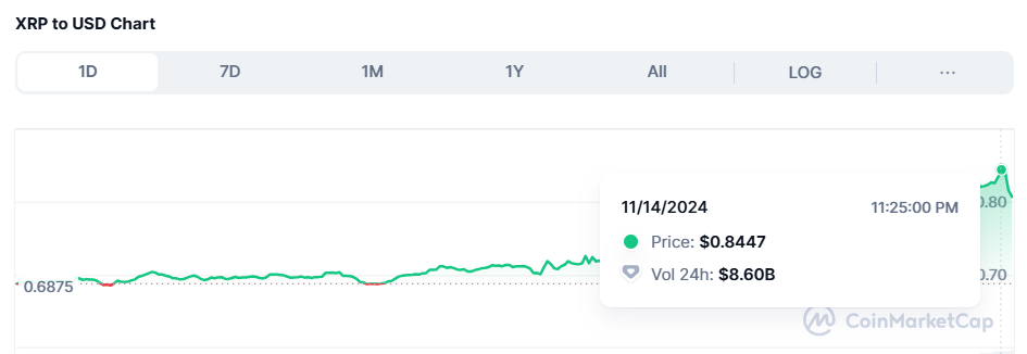 V pozoruhodnom zvrate udalostí XRP momentálne vedie rastový trh altcoinov, zatiaľ čo Bitcoin sa ochladzuje po niekoľkých dňoch vzostupnej dynamiky. Len za posledných 24 hodín XRP vzrástol o viac ako 21 %, keď vyskočil z 0,680 dolára na 0,8447 dolára.