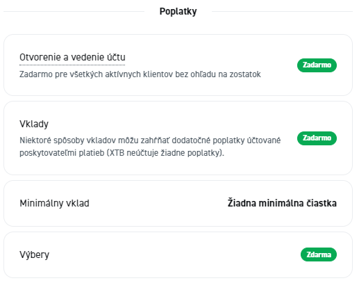 Pre obe druhy aktív platí, že za otvorenie účtu, vedenie účtu, vklady a výbery XTB neúčtuje žiadne poplatky.