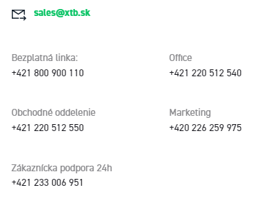 Jednou z najväčších výhod XTB je možnosť konzultácie priamo so slovenskou podporou. Komunikácia môže prebiehať buď to telefonicky, online chatom alebo aj e-mailami. Taktiež je k dispozícii zákaznícka podpora nonstop. Všetky dôležité kontakty sú zobrazené na obrázku dole.