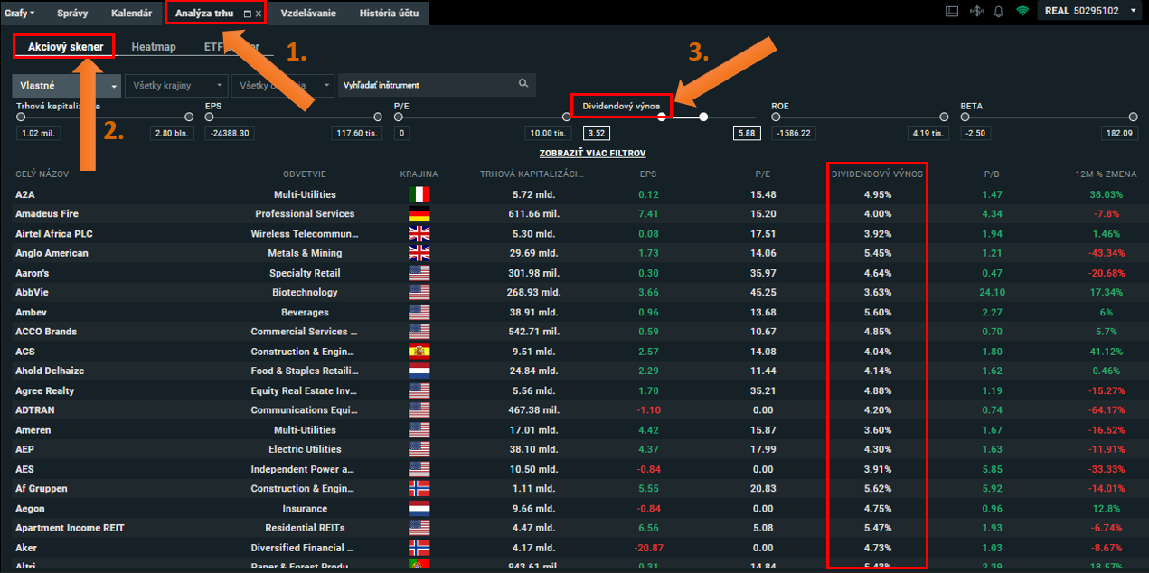 Na obchodnej platforme Xstation 5 stačí hore v sekcii zvoliť „Analýza trhu” a následne „Akciový skener”. V tejto sekcii si viete sami filtrovať akcie podľa hornej a dolnej hranice dividendového výnosu. Podobné filtrovanie dokážete aplikovať aj na ETF v sekcii „ETF skener”.
