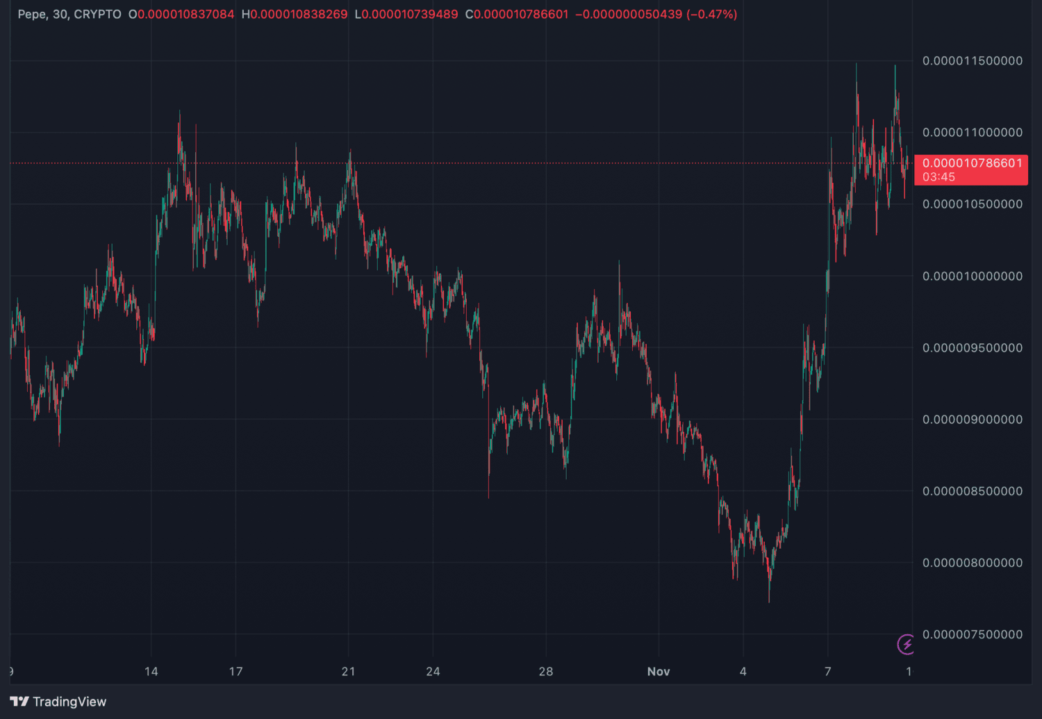 PEPE je nový memecoin spustený na Ethereu ako pocta slávnemu internetovému meme Pepe the Frog, ktorý vytvoril Matt Furie. PEPE si zachováva svoje korene, udržiava veci jednoduché a zábavné, oslovuje krypto komunitu politikou bez poplatkov a je úprimný ohľadom svojho nedostatku využitia. Koncom apríla až mája 2023 PEPE zažil explozívny nárast, pričom jeho trhová kapitalizácia dosiahla vrchol 1,6 miliardy dolárov. Prví držitelia zaznamenali ohromujúce zisky a coin pritiahol silnú komunitu podobne zmýšľajúcich nadšencov.