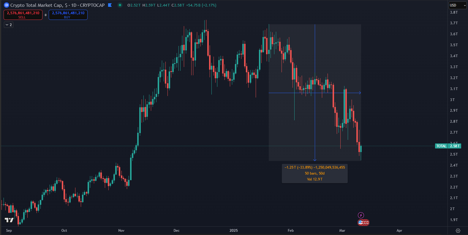 V priebehu posledného mesiaca došlo na kryptomenovom trhu k sérii udalostí, ktoré výrazne ovplyvnili ceny digitálnych aktív. Trhová kapitalizácia kryptomien, ktorá v januári 2025 dosiahla historické maximum, sa znížila o viac ako 1,2 bilióna dolárov, čím sa vrátila na úrovne z novembra 2024, ukazujú údaje z TradingView. Tento pokles vyvolal obavy medzi investormi a analytikmi, ktorí sa snažia pochopiť príčiny tohto trendu a predpovedať jeho ďalší vývoj.