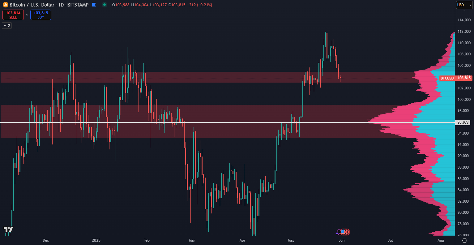 Od svojho historického maxima z 22. mája sa BTC prepadol o 7,4 % a v sobotu ráno sa obchodoval okolo hranice 103 800 dolárov. Obchodná aktivita sa síce zvýšila, pričom objem dosiahol 150,41 miliardy dolárov, no prevažovali predajné príkazy.