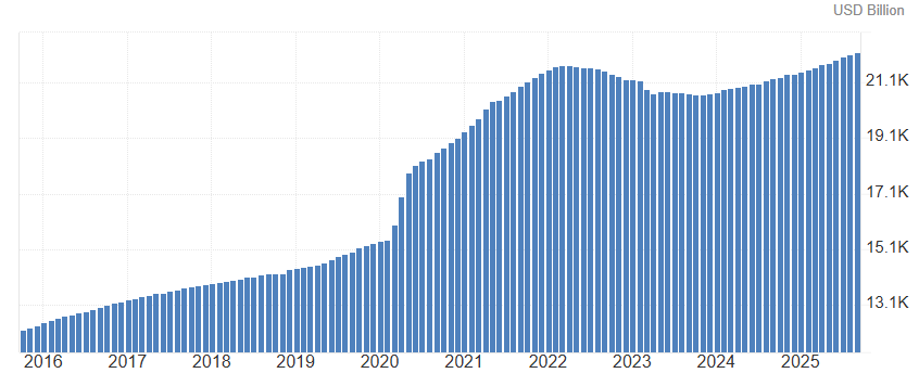 Podľa údajov TradingEconomics, peňažná zásoba M2 v USA dosiahla v máji 2025 hodnotu 21,94 bilióna dolárov, čo predstavuje mierny nárast oproti aprílu (21,86 bilióna). Historicky sa M2 pohybovala priemerne okolo 5,615 bilióna dolárov od roku 1959, pričom rekordne vysoká bola v septembri 2025 s 22,212,5 bilióna a najnižšia v januári 1959 s 286,6 miliardy dolárov. Tento rast ukazuje dlhodobú expanziu peňažnej zásoby a dôvod straty hodnoty dolára.