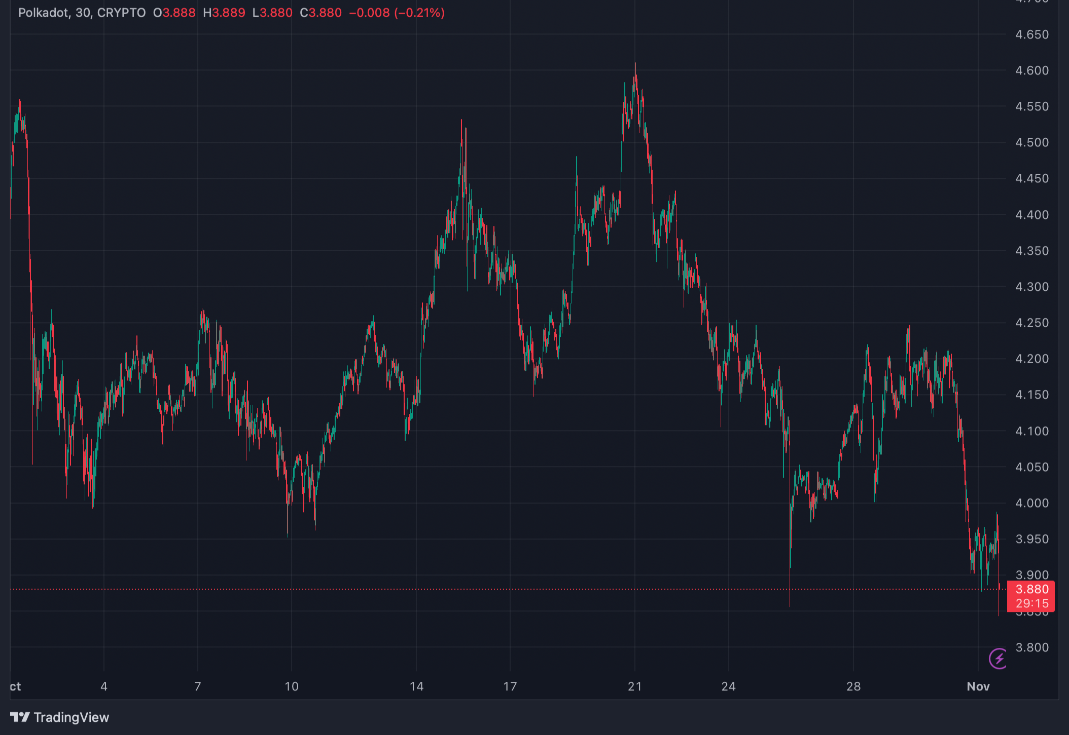 Cena Polkadotu klesá, za posledný týždeň o viac ako 6 % a za posledný mesiac o viac ako 5 %. Obchoduje sa medzi 3,78 a 4,55 dolára, je pod 10-dňovým aj 100-dňovým jednoduchým kĺzavým priemerom. RSI je okolo 41, čo naznačuje neutrálny momentum. S mierne negatívnou úrovňou MACD by mohla pretrvávať medvedia nálada. Ak však DOT vystúpi k najbližšiemu odporu na úrovni 4,96 dolára, predstavovalo by to potenciálny zisk približne 24 % zo súčasných úrovní. Prekročenie tejto úrovne by mohlo viesť k druhému odporu, pridávajúc ďalších 15 %. Na druhej strane, pokles k najbližšej podpore na úrovni 3,42 dolára by znamenal stratu približne 14 %. Investori sledujú tieto kľúčové úrovne pre smerovanie.