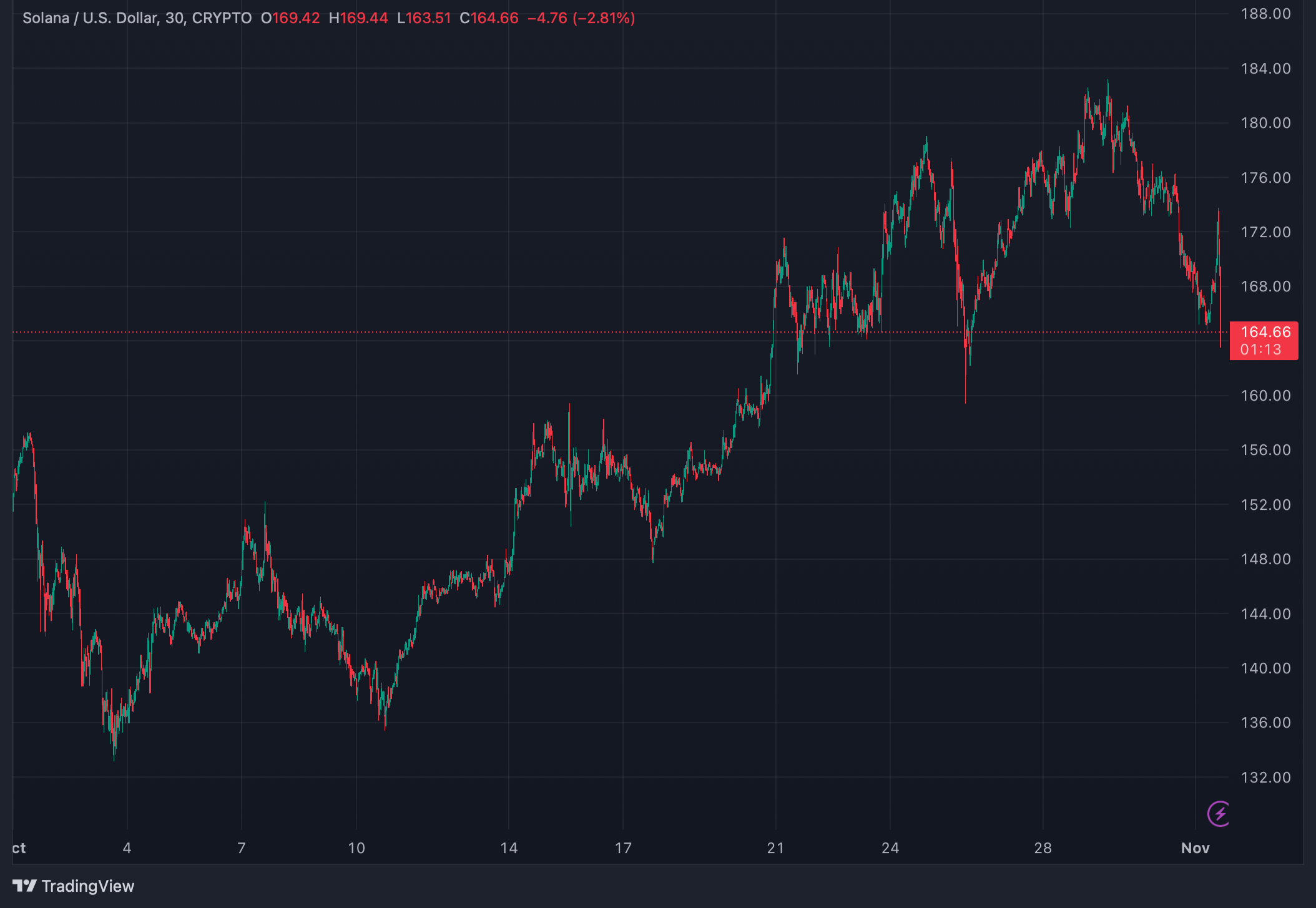 Solana (SOL) sa obchoduje medzi 164,10 a 184,02 dolára. Za posledný týždeň jej cena klesla takmer o 5 %, ale za posledný mesiac vzrástla približne o 16 %. Najbližšia úroveň podpory je 151,68 dolára, zatiaľ čo najbližší odpor je 191,52 dolára. Index relatívnej sily (RSI) je na úrovni 46,93, čo naznačuje neutrálny momentum. Úroveň MACD je -1,38, naznačujúca možný medvedí trend. Ak SOL prerazí nad odpor 191,52 dolára, mohol by mieriť na ďalší cieľ 211,45 dolára, čo by predstavovalo nárast približne o 10 %. Ak však klesne pod podporu 151,68 dolára, môže klesnúť smerom k 131,77 dolára. Obchodníci tieto úrovne pozorne sledujú.