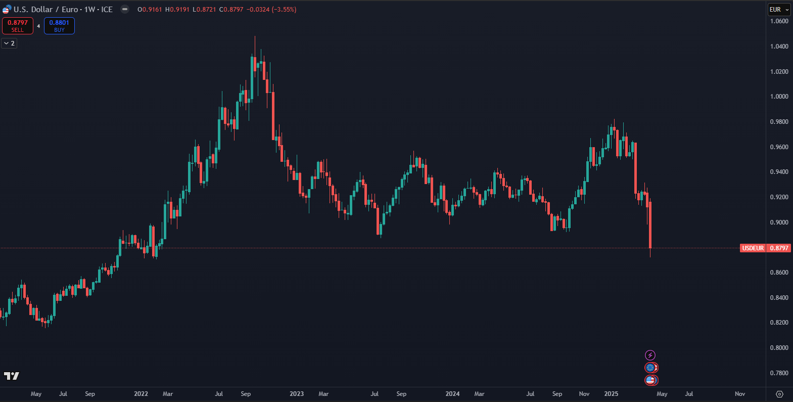 Dolár sa nedávno prepadol na 10-ročné minimum voči švajčiarskemu franku a 3-ročné minimum voči euru. Reakcia Číny na nové 145 % americké clá v podobe 125 % odvetných ciel len prehĺbila neistotu. Jedno euro má v súčasnosti podľa údajov TradingView hodnotu 1,14 dolára, čo je najviac od začiatku vojny na Ukrajine.
