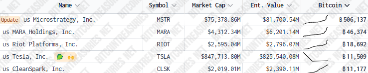 Na základe údajov Bitcointreasuries po Strategy nasledujú spoločnosti ako MARA Holdings (46 374 BTC), Riot Platforms (18 692 BTC), Tesla (11 509 BTC) a CleanSpark (11 177 BTC).
