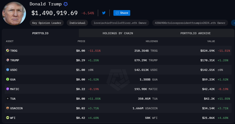 Situácia je komplikovaná skutočnosťou, že prezident Trump si udržiava značný podiel v spoločnosti Trump Media & Technology Group a nedávno spustil viacero krypto projektov. Tri dni pred inauguráciou prezident predstavil memetoken s názvom TRUMP prostredníctvom svojej spoločnosti CIC Digital LLC, ktorá vlastní 80 % celkovej ponuky tokenu. Arkham Intelligence taktiež verejne zdieľa portfólio Donalda Trumpa.