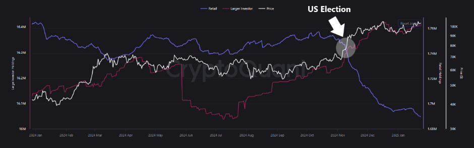 Zatiaľ čo veľkí investori navyšujú svoje podiely, malí investori sa, naopak, rozhodli zmenšiť svoje pozície. Ich podiely klesli z 1,75 mil. BTC na 1,69 mil. BTC v rovnakom období. Tento trend by mohol naznačovať posun v rozložení trhu a vplyve jednotlivých držiteľov kapitálu. Na túto skutočnosť upozornil CryptoQuant už koncom januára.