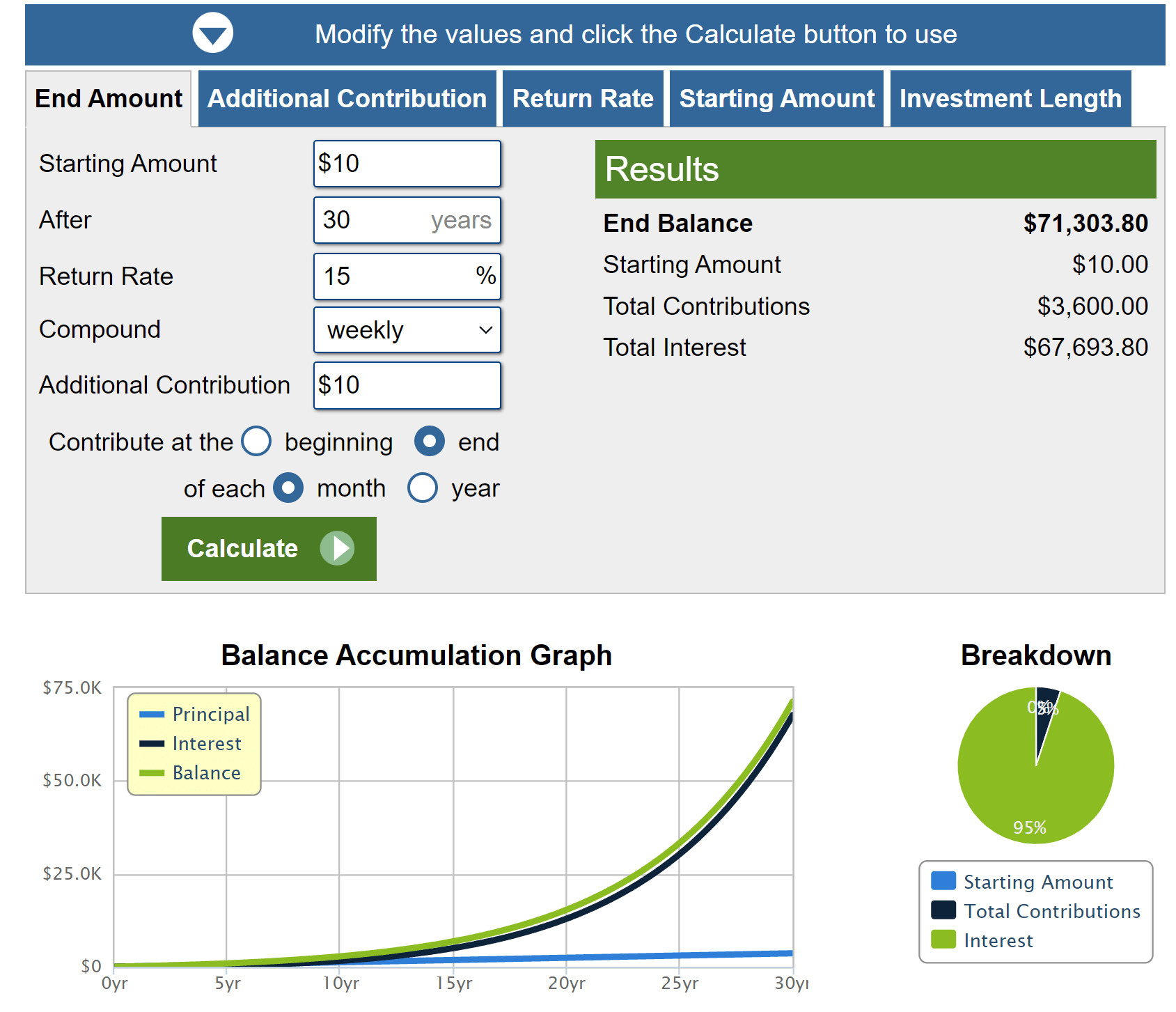 Väčšinou burzy limitujú minimálny nákup kryptomien nad 10 eur. Čiže si môžeš týždenne odkladať aj 10 eur a tie postupne investovať. Ukážme si reálny príklad, čo by sa stalo, ak by sme tak robili počas nasledujúcich 30 rokov. Do investičnej kalkulačky som zadal konzervatívny priemerný ročný výnos 15 % (od vzniku dokonca Bitcoin priemerne mesačne rástol o 50 % za rok). Celkovo by sme za 30 rokov investovania vložili 3 600 eur. Po tomto časovom období by sme mali takmer 72 000 eur, čo už je pomerne slušný kapitál napríklad na kúpu nehnuteľnosti, ktorú môžeme dať do prenájmu a mesačne zarábať okolo 400 eur.