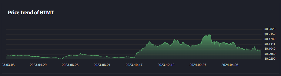 Token BTMT (BITmarkets Token) z dlhodobého hľadiska zatiaľ cenovo rastie. Bol predstavený v marci 2023 a jeho cieľom je poskytnúť používateľom burzy exkluzívne výhody a funkcie. Cenový vývoj grafu môžete vidieť nižšie na obrázku. Okrem úroku zo stakingu totiž zarábate aj na samotnom náraste trhovej ceny BTMT.