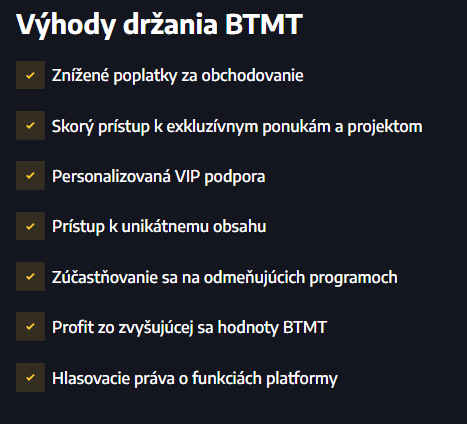 Vďaka držbe BTMT máte benefit vo forme nižších poplatkov za obchodovanie s kryptomenami. Taktiež získate VIP podporu. Ak sa rozhodnete pre staking BTMT, taktiež pomáhate rásť aj samotnej burze. BITmarkets uvádza, že väčšinu získaných prostriedkov plánuje použiť na ďalšiu expanziu, optimalizáciu platformy, marketing a akvizície.