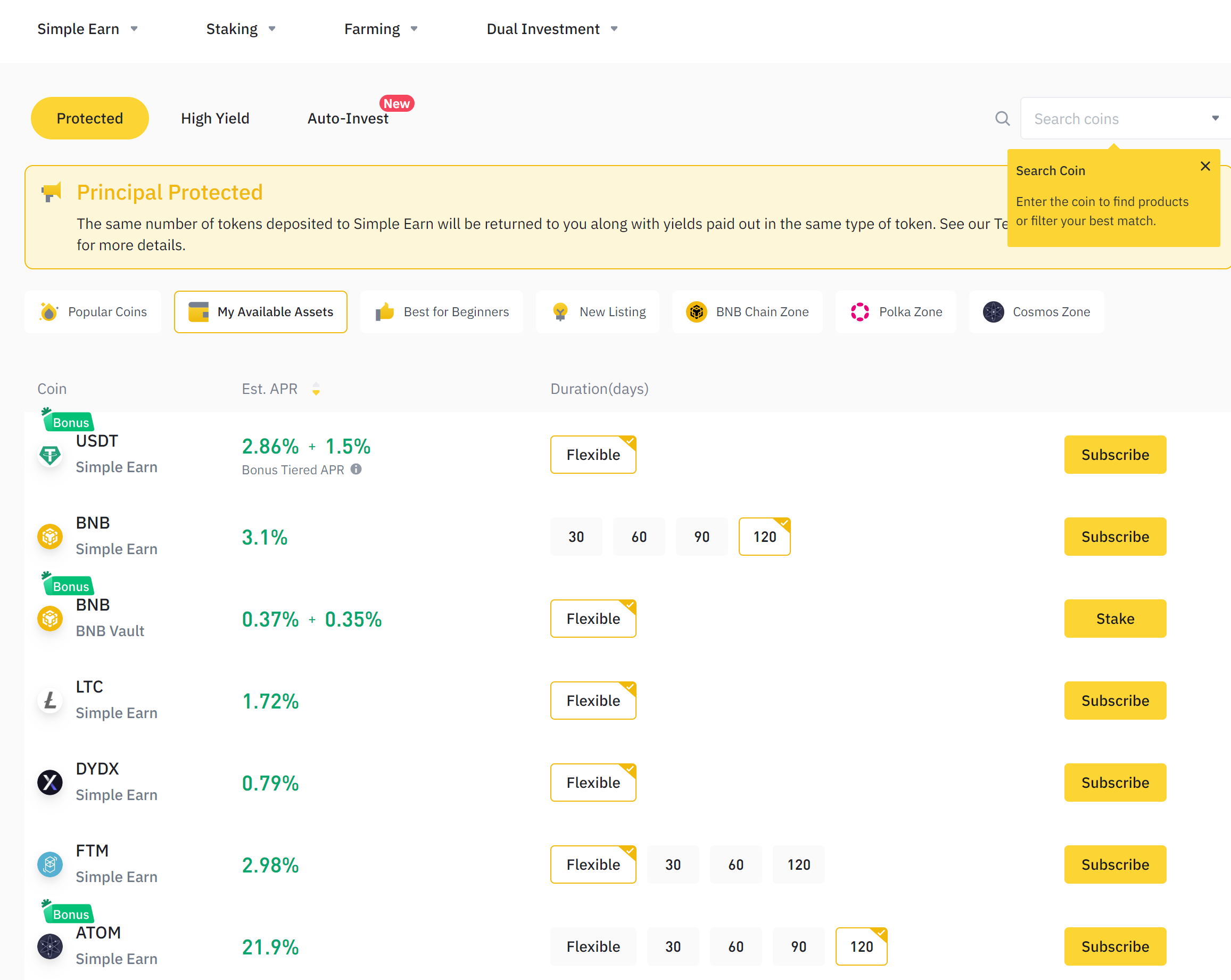 Po založení účtu a nakúpení kryptomien, ktoré plánuješ zhodnocovať, sa môžeš presunúť do kategórie Earn a Binance Earn. Môžeš si vybrať medzi 3 kategóriami zhodnotenia: Simple Earn a Staking, Farming a Dual Investment.