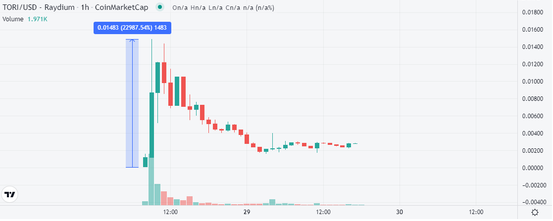 Podľa údajov Lookonchain obchodník kúpil za 344 SOL v hodnote 49 000 dolárov až 261,4 milióna tokenu TORI. Solana bola presunutá z burzy Binance na dve nové adresy 25. a 26. apríla. Následne došlo k nákupu a obchodník presunul TORI na viacero adries 28. apríla. Hneď po nákupe sa objem tokenov dostal na hodnotu 2 miliónov dolárov.