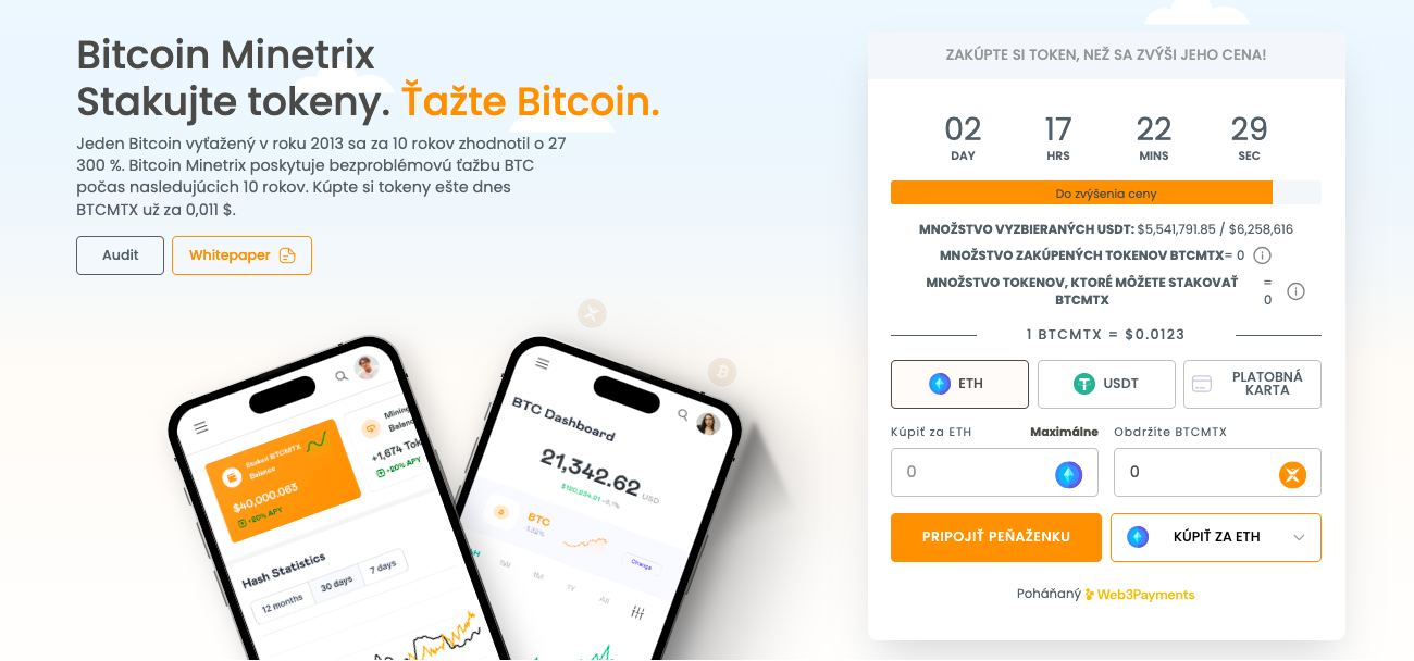 Bitcoin Minetrix ponúka možnosť ťažiť Bitcoin bežným ľuďom cez cloudovú službu. Potenciál BTCMTX odráža aj doteraz vyzbieraná suma v predpredaji, ktorá prekročila hranicu 5,5 milióna dolárov.