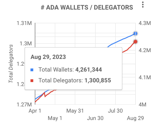 Počet nových jedinečných peňaženiek vzrástol od 1. apríla o 6 % zo 4,02 milióna na 4,26 milióna ku dňu 29. augusta 2023. Počas tohto obdobia stúpol počet peňaženiek v priemere o 1 600 denne, ukazujú údaje Cardano Blockchain Insights. Najvyšší denný nárast sa uskutočnil 10. júna s hodnotou takmer 4 000. Naopak, najslabší rast bol 18. júla s iba jedinou novo registrovanou peňaženkou.