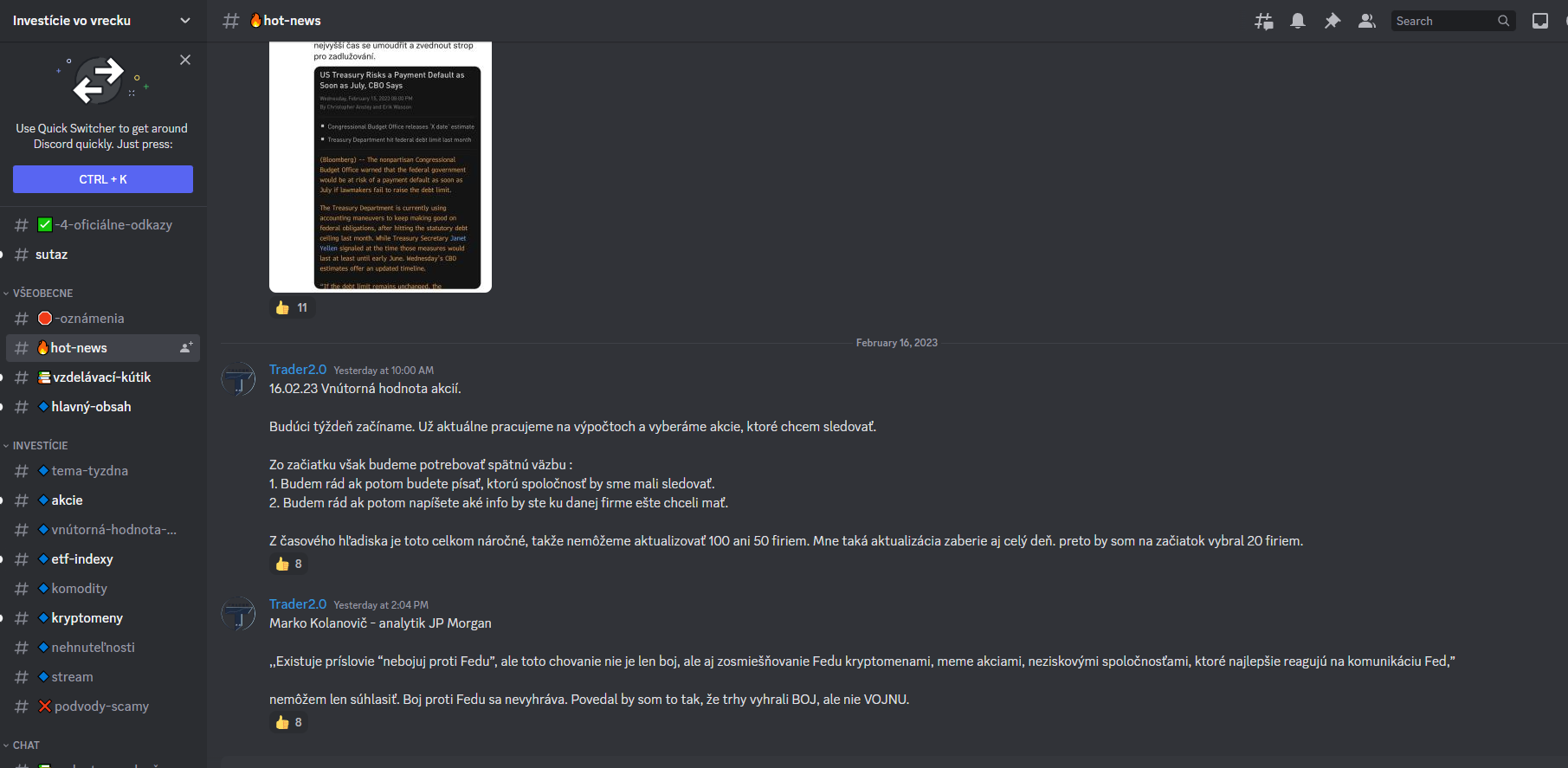 Nájdeš tu napríklad miestnosti, kde sa dozvieš aktuálne informácie z burzového sveta. Hlavný ťahák skupiny, prečo by si sa sem mal pridať, je vzdelávacia časť, kde Jakub prakticky každý deň pridáva nové rady a tipy. Na záver ti dávame do pozornosti súťaž, ktorá aktuálne prebieha v komunite.