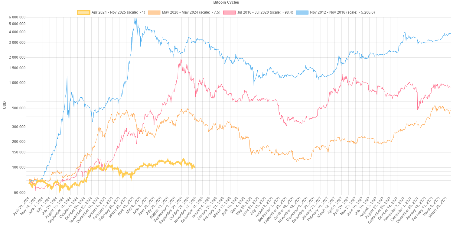 126 200 dolárov mohol byť absolútny vrchol cyklu. Zdroj: bitcoincyclescomparison.com