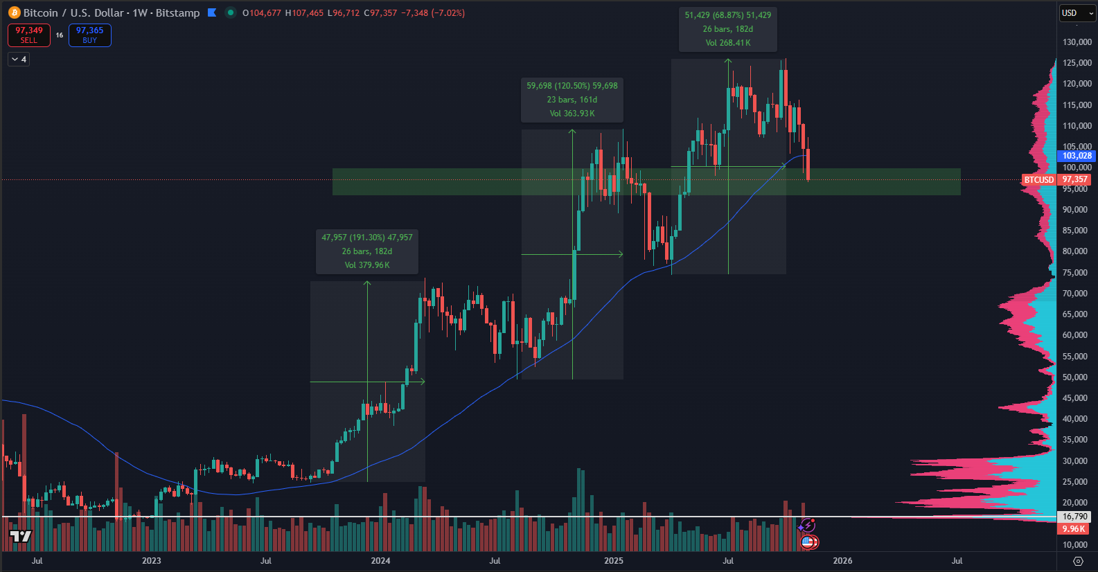 Cena sa momentálne nachádza v kľúčovom supportnom pásme medzi 99 000 a 93 000 dolármi, kde sa v minulosti vyskytovali zvýšené objemy obchodovania. Práve preto existuje šanca, že v tejto zóne by Bitcoin mohol nájsť svoje lokálne dno.
