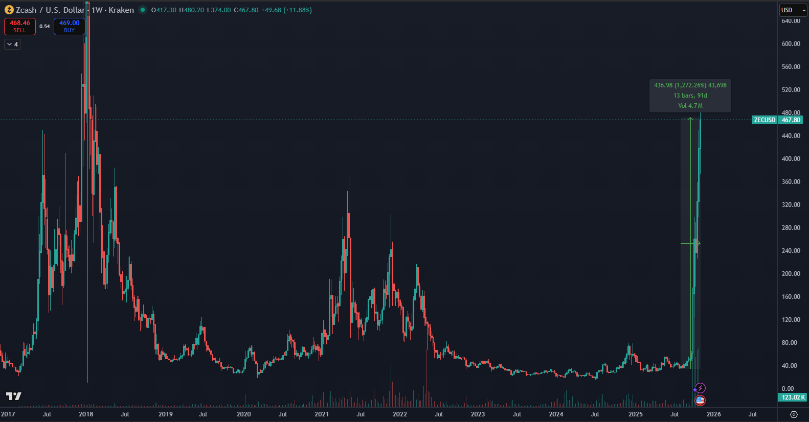 Zcash, jedna z najznámejších kryptomien zameraných na anonymitu, zažíva návrat, aký trh s kryptomenami dlho nevidel. Podľa údajov TradingView token ZEC v posledných týždňoch vystrelil na osemročné maximum okolo 480 dolárov. Vďaka tomu jeho trhová kapitalizácia presiahla 7 miliárd dolárov. Týmto krokom Zcash prvýkrát prekonal Monero (XMR) a stal sa najväčšou súkromnou kryptomenou na trhu, ukazuje rebríček CoinMarketCap.