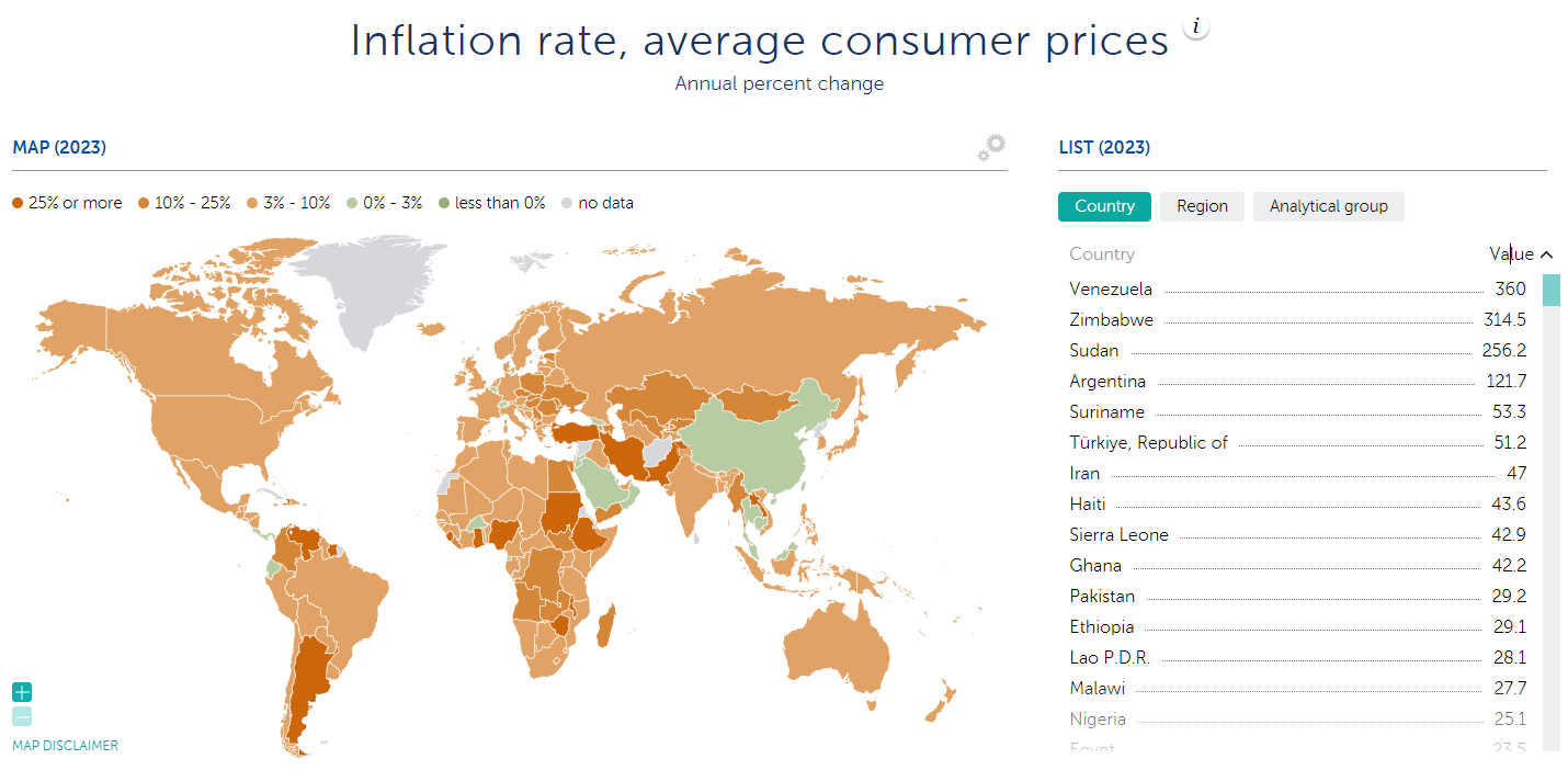 Na základe údajov Medzinárodného menového fondu (MMF) má najvyššiu infláciu na svete Venezuela na úrovni 360 %. Nasleduje Zimbabwe, ktoré bojuje s infláciou na úrovni 314,5 %. Vysoké tempo rastu cien má aj Sudán (256,2 %) a Argentína (121,7 %). Všetky tieto krajiny bojujú s extrémne vysokým prepadom kúpnej sily národných mien.