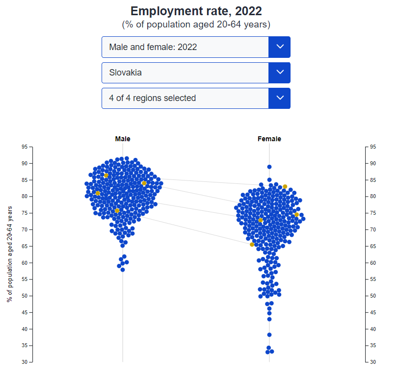 Obrázok nižšie zobrazuje rozdiely v zamestnanosti podľa pohlavia vo všetkých členských štátoch EÚ, pričom zvýraznené sú hodnoty Slovenska. Pre lepšie pochopenie si tieto údaje preložíme do konkrétnych čísel. Štyri žlté guličky reprezentujú zamestnanosť žien a mužov podľa štyroch regiónov – východné, západné, stredné Slovensko a Bratislavský kraj.