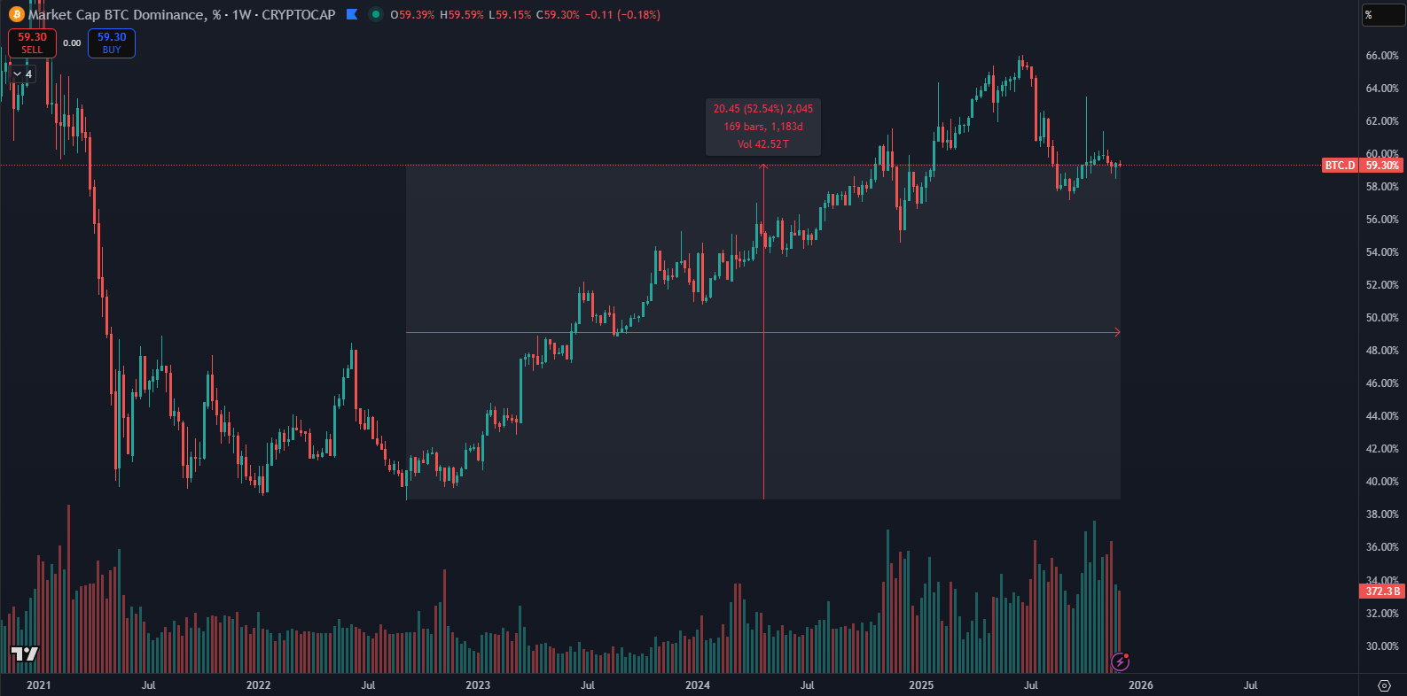 Zaujímavé však je, že stabilita nie je jediným prekvapením. Bitcoin sa postupne odpojil od zvyšku digitálnych aktív a altcoiny si začali kráčať vlastným tempom. Dôsledkom tejto nerovnováhy je pozoruhodný nárast Bitcoin dominancie, ktorá sa počas dlhého cyklu postupne posunula zo 39 % na približne 59 %, čo predstavuje nárast o 52 %.
