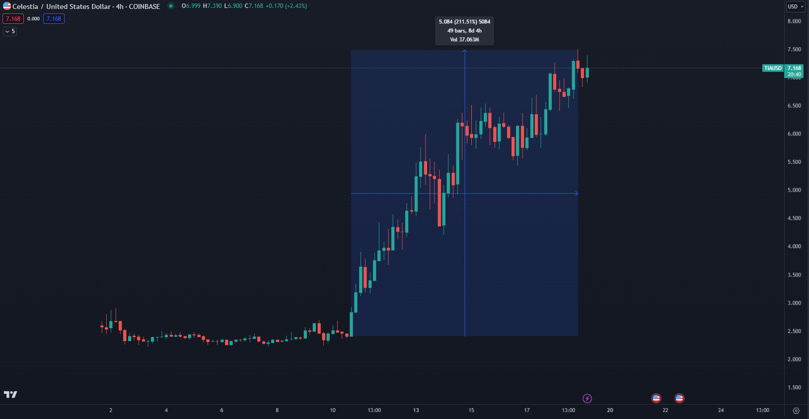 Kryptomena TIA narástla o 200 percent. Zdroj: TradingView