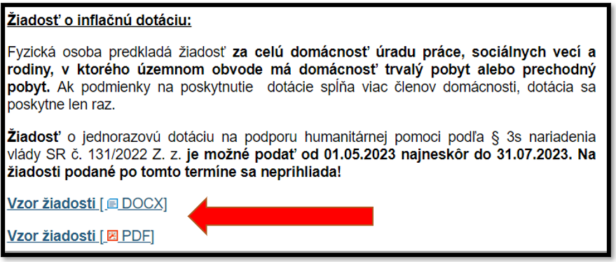 Vzor žiadosti o finančný príspevok. Zdroj: Ústredie práce, sociálnych vecí a rodiny