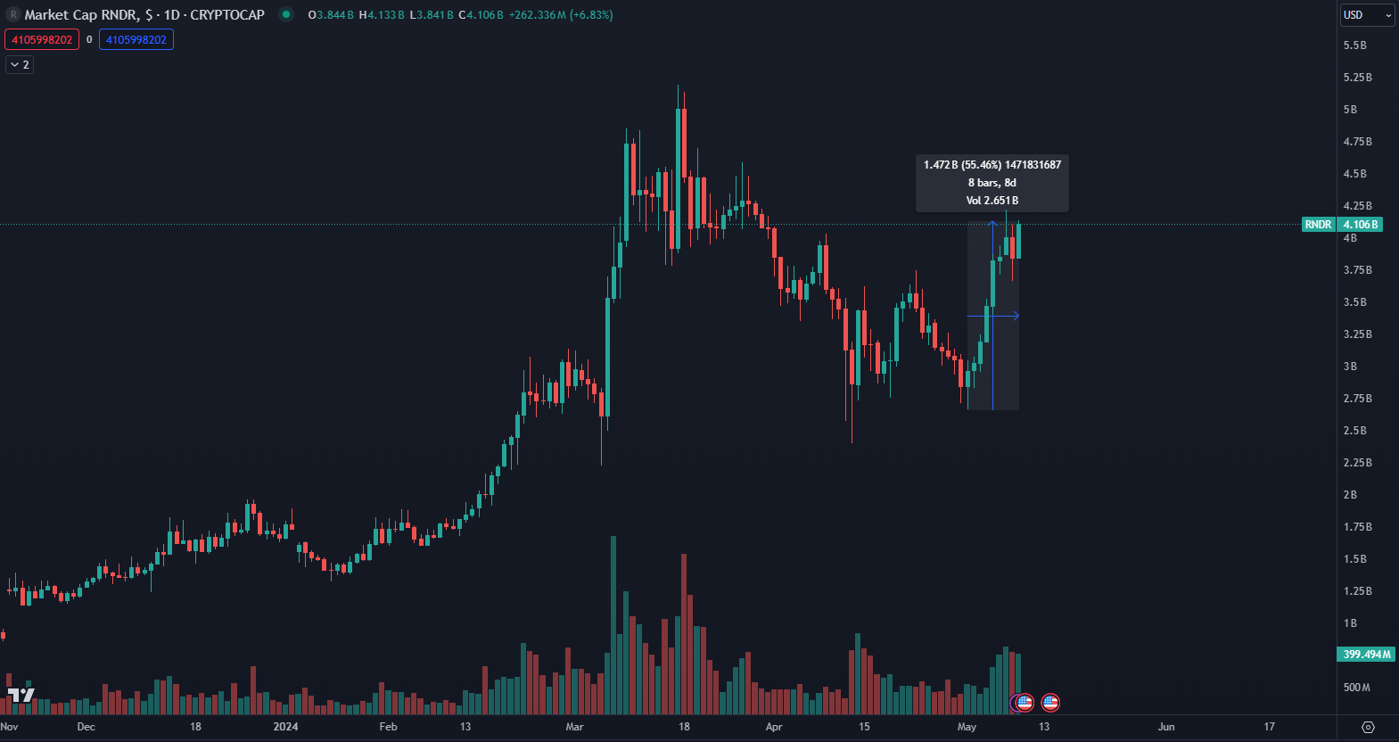 Vďaka nedávnemu rastu sa Render stal 24. najväčšou kryptomenou na svete s trhovou kapitalizáciou 4,11 miliardy dolárov a denným objemom obchodovania 430,94 milióna dolárov. Objem obchodovania dosahuje 10,42 % z celkovej trhovej kapitalizácie, podľa údajov CoinMarketCap.