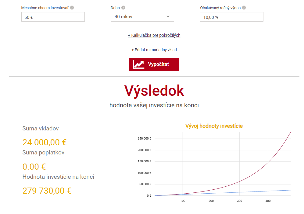 - Konkrétne porovnanie mesačného vkladu 50 eur do poistenia verzus do indexového fondu S&P 500.