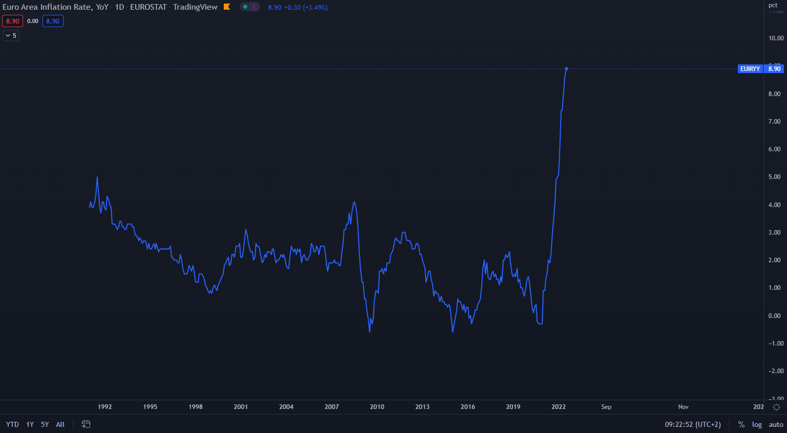 Je teda zlato vhodné držať v roku 2022? Bližší pohľad na graf inflácie v Európe definuje aktuálny rast na hladine 8,90 %. Ak teda zlato stratilo v roku 2022 5,37 %, tak v porovnaní s infláciou je to stále malé znehodnotenie. Pre porovnanie, index SPX spadol od 1. januára o 16 % a Bitcoin o 57 %.