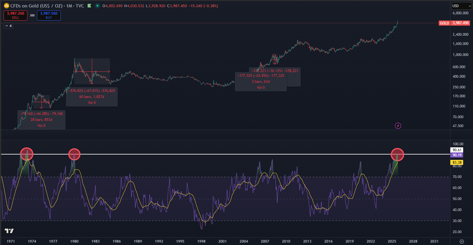 Podľa technického indikátora RSI (Relative Strength Index) sa zlato dostalo do pásma, ktoré naznačuje, že jeho rast môže byť už príliš prudký. RSI sleduje rovnováhu medzi nákupným a predajným tlakom. Ak hodnota presiahne 70 bodov, ide o signál, že aktívum je „prekúpené”. Teraz však zlato prekonalo až 90 bodov zo 100, čo je extrémne vysoká úroveň, naposledy zaznamenaná v roku 1979.