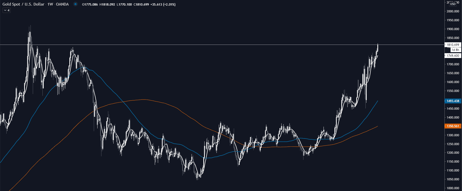 Ako vidieť na týždennom grafe, zlato je už celkom vysoko a zaslúžilo by si aspoň menšiu korektúru. Od svojho ATH to však zlato už nemá ďaleko, pretože jeho all time high je na úrovni 1 922 dolárov. V poslednom období sme videli all time high na akciách Tesla alebo na kryptomene LINK. Hneď ako tieto dve entity urobili all time high, tak prišla ešte väčšia pumpa. FOMO, záujem na sociálnych sieťach, v médiách. Rovnako to môže byť aj pri zlate. Keď zlato dosiahne all time high, tak môže prísť ešte strmší rast, pretože dostane obrovskú pozornosť médií a na trh bude naskakovať retail.