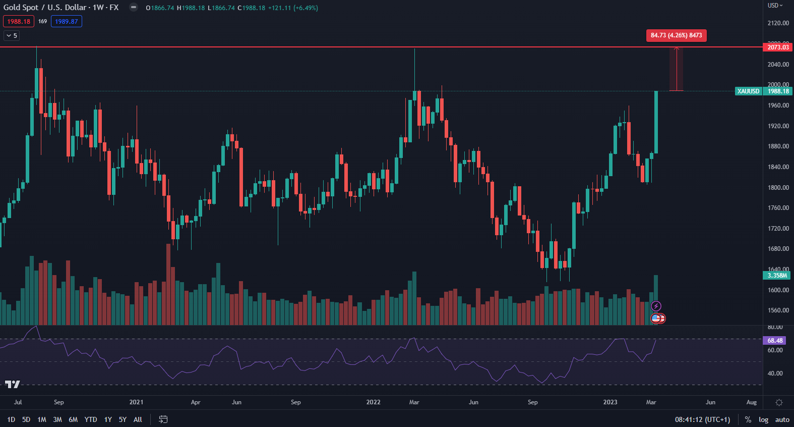 Najznámejší drahý kov opäť zaznamenal raketový rast a dokázal narásť za jediný týždeň až o 6,50 %. Naposledy sme boli svedkami takej silnej týždennej sviečky v marci 2020, kedy ale trhová cena bola vzdialená od historického maxima. Dnes je situácia odlišná a stačí aby zlato dosiahlo rast už len 4,25 % na to, aby vytvorilo nový vrchol.
