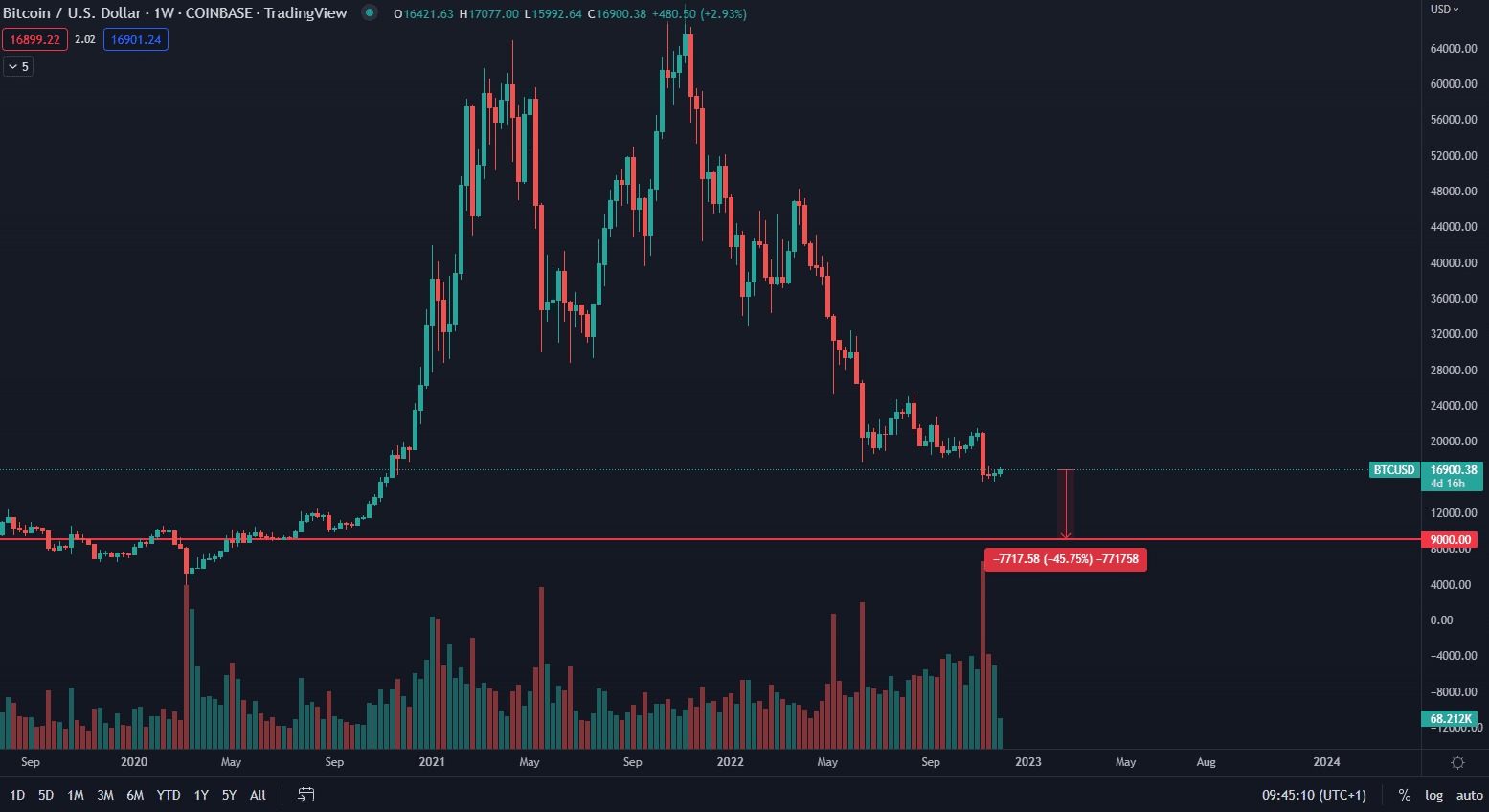 Soloway krach burzy FTX prirovnal ku krachu americkej banky Lehman Brothers v roku 2008. Výkonnosť indexu S&P 500 po tejto udalosti zaznamenala pokles o približne 45 % v priebehu polroka. Pre výpočet korekcie Bitcoinu Soloway použil rovnaký vzorec, čo znamená, že Bitcoin by mal klesnúť na približne 9 000 dolárov v nasledujúcich mesiacoch po krachu FTX.