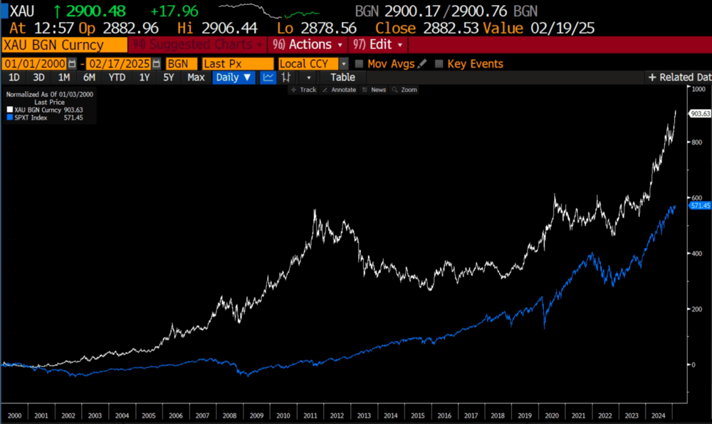 Ak sa pozrieme na iné tradičné aktíva, zistíme prekvapivo, že sa zlatu v danom období paradoxne darilo lepšie ako akciám. Od roku 2000 totiž vzrástlo o 904 %, čo zodpovedá ročnému rastu o približne 9,6 %. Na grafe je zlato znázornené bielou farbou a index S&P 500 modrou.