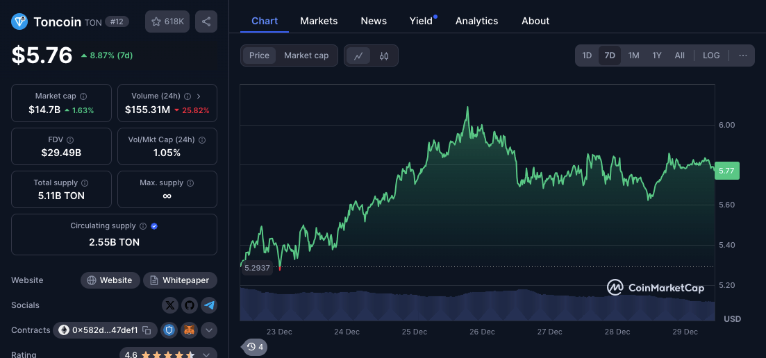 Toncoin začína vykazovať známky oživenia. Cena Toncoinu je momentálne na úrovni 5,78 dolára, čo predstavuje malý denný pokles, ale týždenný nárast o 6 % podľa údajov CoinGecko. Tento rast naznačuje možnosť väčšieho rastu, najmä keď sa trh javí stabilnejší.
