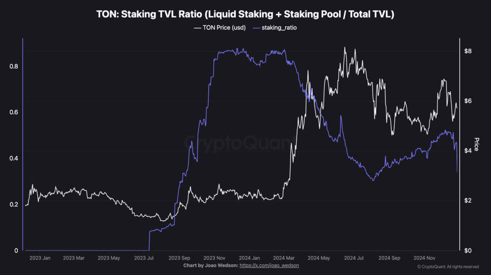 Významnou zmenou je pokles objemu prostriedkov v stakingu Toncoinu. Analytici to považujú za pozitívny signál, pretože to znamená väčšiu dostupnú likviditu. Podobná situácia nastala začiatkom roka 2024, keď cena Toncoinu vzrástla po presune prostriedkov zo stakingu na burzy. Naznačuje to rastúci záujem o TON pre transakcie namiesto stakingu.