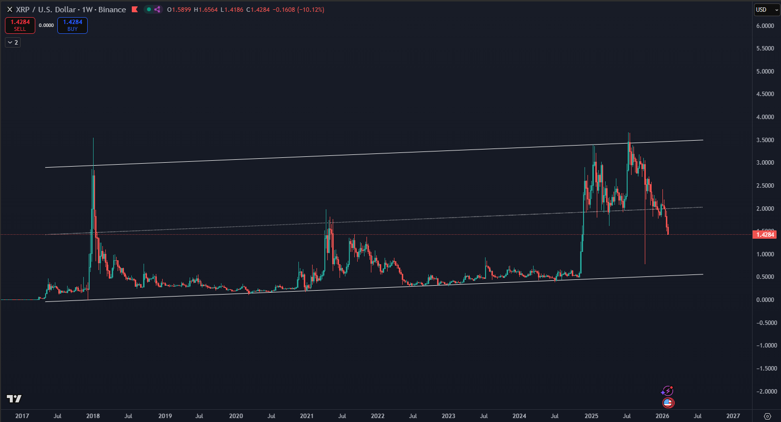 Z makro pohľadu XRP stále drží viacročnú formáciu, ktorá naznačuje pokračujúce stlačenie ceny. Takéto formácie sa historicky spájajú s prudkými expanziami, keď sa trh rozhodne pre nový smer.