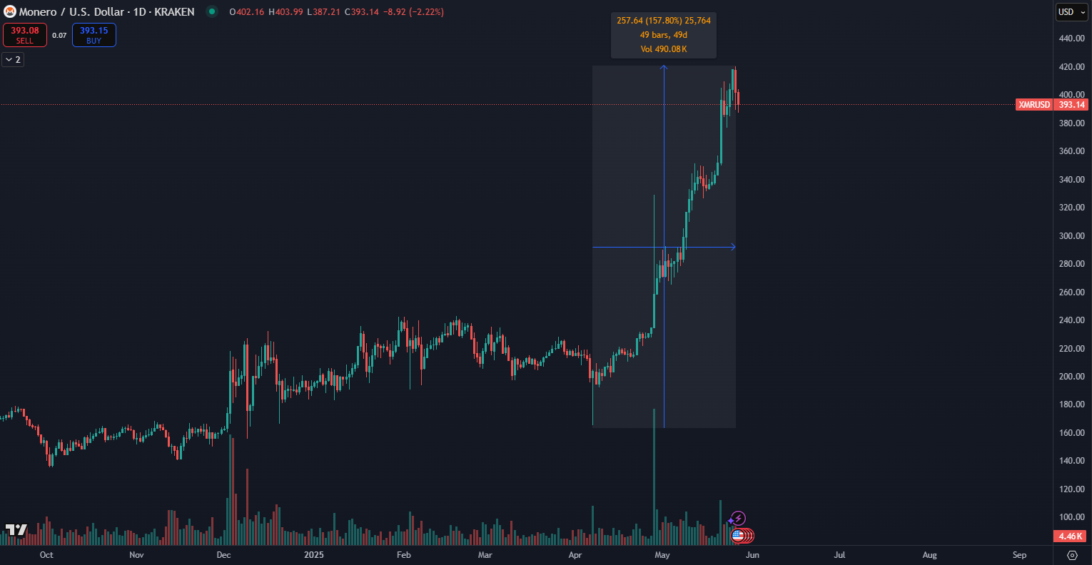 Cena Monera stúpa už druhý mesiac bez prestávky. Za posledných 50 dní zaznamenalo XMR nárast o 155 %. Aktuálne sa obchoduje za 393 dolárov, čo je najviac od mája 2021, keď dosiahlo svoje historické maximum na úrovni 517 dolárov.