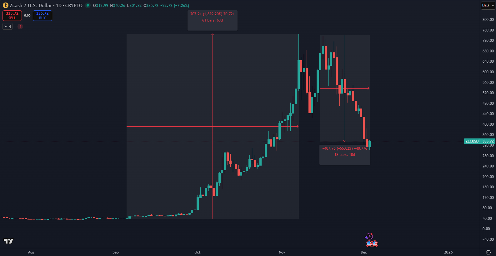- Zcash zaznamenal strmý pokles po vyprchaní eufórie.