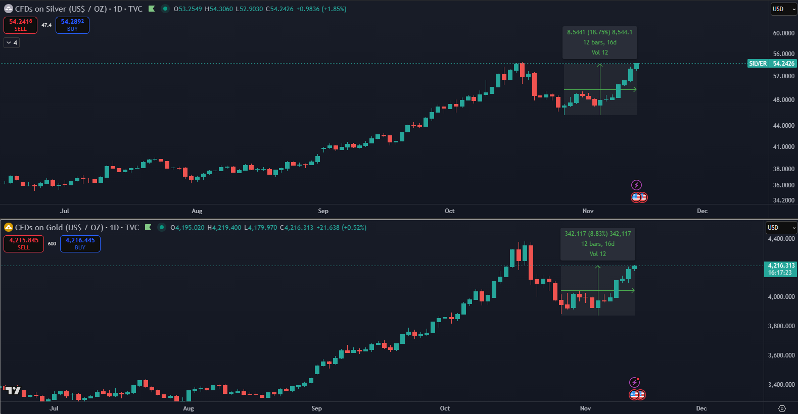 Striebro počas posledných dvoch týždňov prešlo výrazným rastom o 18 %, zatiaľ čo zlato pridalo len 8 %. Tento prudký nárast nasledoval po krátkej, ale citeľnej korekcii, ktorá prebiehala od 17. do 28. októbra. Po nej sa investori vrátili k drahým kovom ako k bezpečnému prístavu v období rastúcej globálnej neistoty.