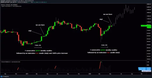 „Pozri, čo sa stalo naposledy, keď sme mali 7 po sebe idúcich zelených týždenných sviečok. Mali sme sviečku „doji”, po ktorej nasledoval 160 % rast. Toto sa môže zopakovať!”