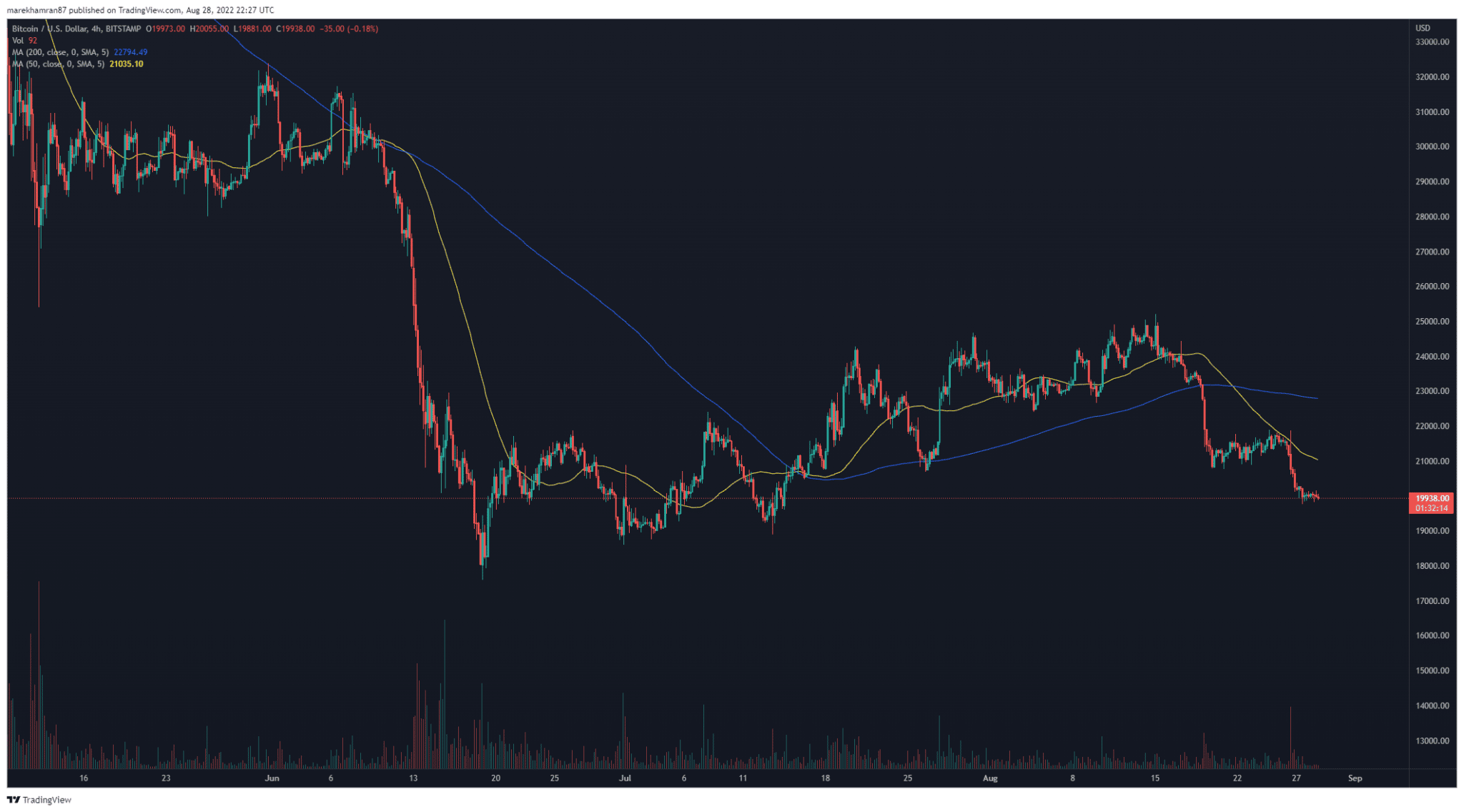Trh s kryptomenami stratil v roku 2022 svoje dominantné postavenie. Zatiaľ nič nenasvedčuje tomu, že by sa trh na čele s Bitcoinom mal otáčať pozitívnejším smerom. Naznačuje to aj súčasná cenová hladina. V čase písania tohto článku sa Bitcoin obchodoval na úrovni 19 938 dolárov. Obavy investorov sa stupňujú, keďže sme na prelome mesiacu august a trhy čaká najhorší mesiac september, keď sa Bitcoin zvykol zväčša prepadnúť.